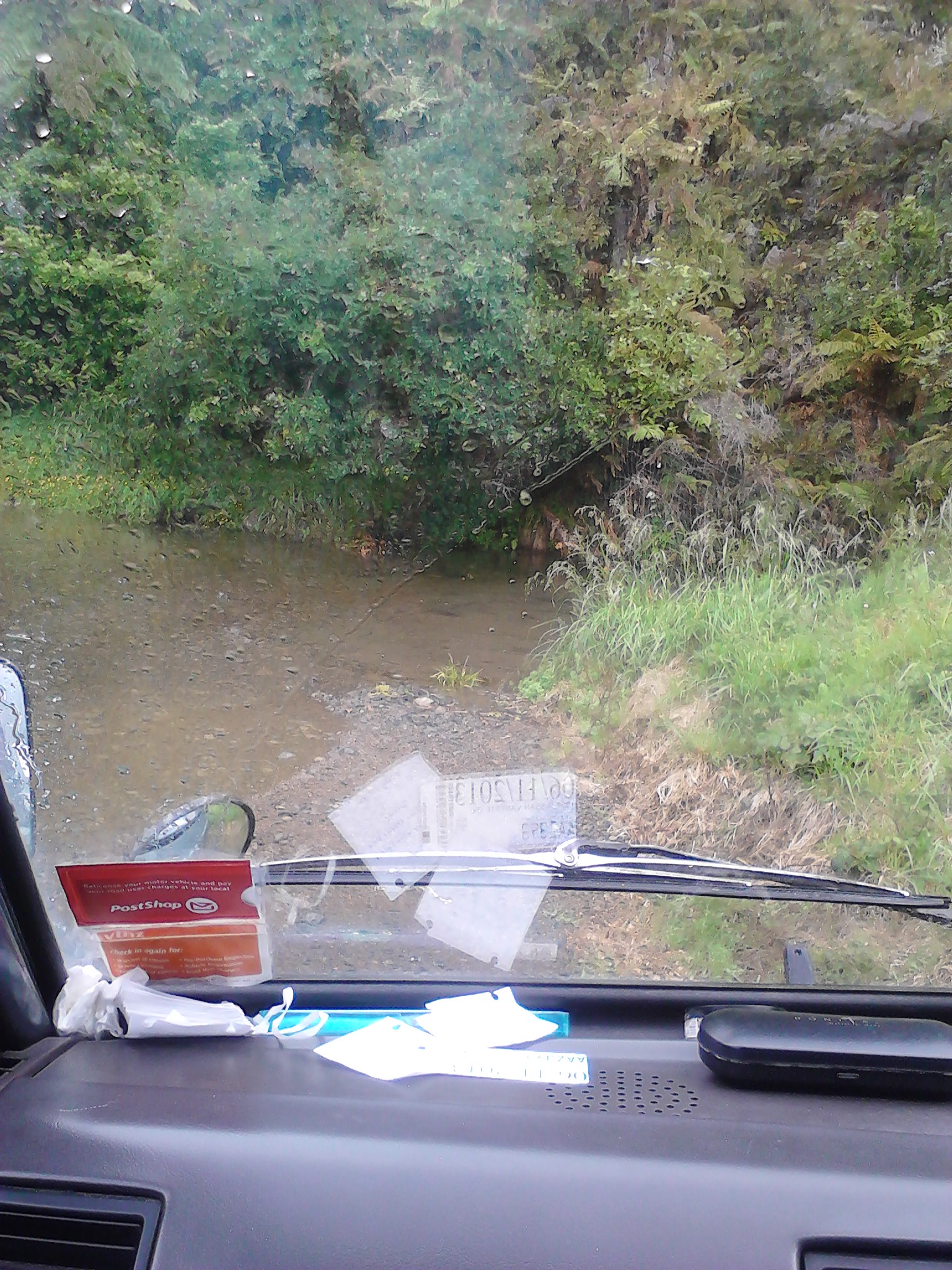 Unser Ziel war ein weiterer DOC, genannt Boulders Campground. Der sollte kostenlos sein, dafür stand aber in der Beschreibung auch, dass der Weg von der Straße zum Campingplatz selbst sehr steil sei und dass man auf dem Web dahin auch noch eine Furt durchqueren müsste. Wir wollten es aber trotzdem probieren. Zunächst sollte es also durch die Furt gehen. Heiko ist vorher noch nie durch eine eben solche gefahren, so dass er den Fehler machte und versuche gaaaaanz langsam und vorsichtig durchzukommen. Das Resultat war, dass Gary genau in der Mitte der Furt nicht mehr vorwärts kam und anfing sich mit seinen Hinterrädern einzugraben. Mit beherztem Spiel mit Vorwärts und Rückwärtsgang gelang es dann aber Gary freizubekommen und die Furt zu überstehen.