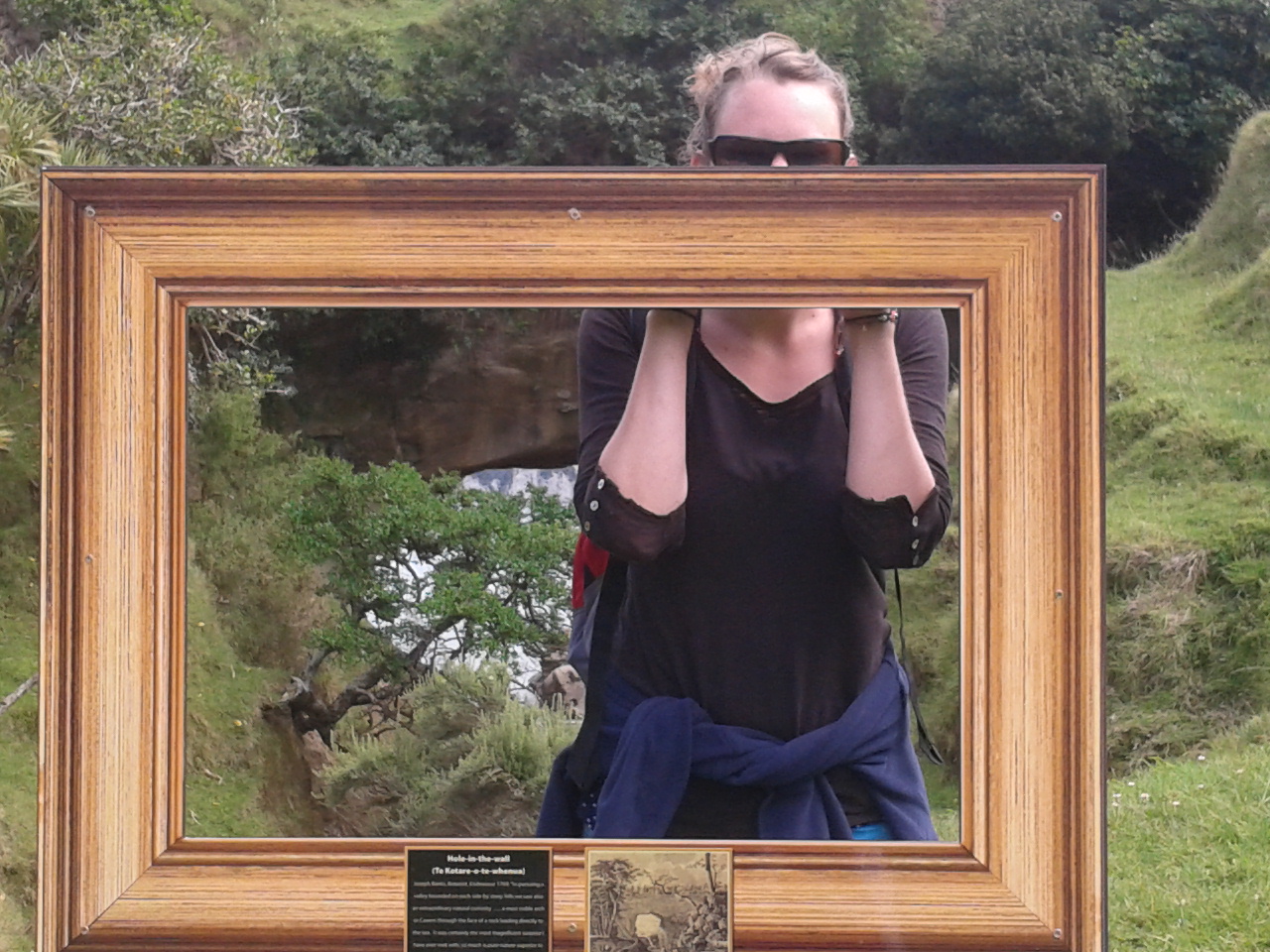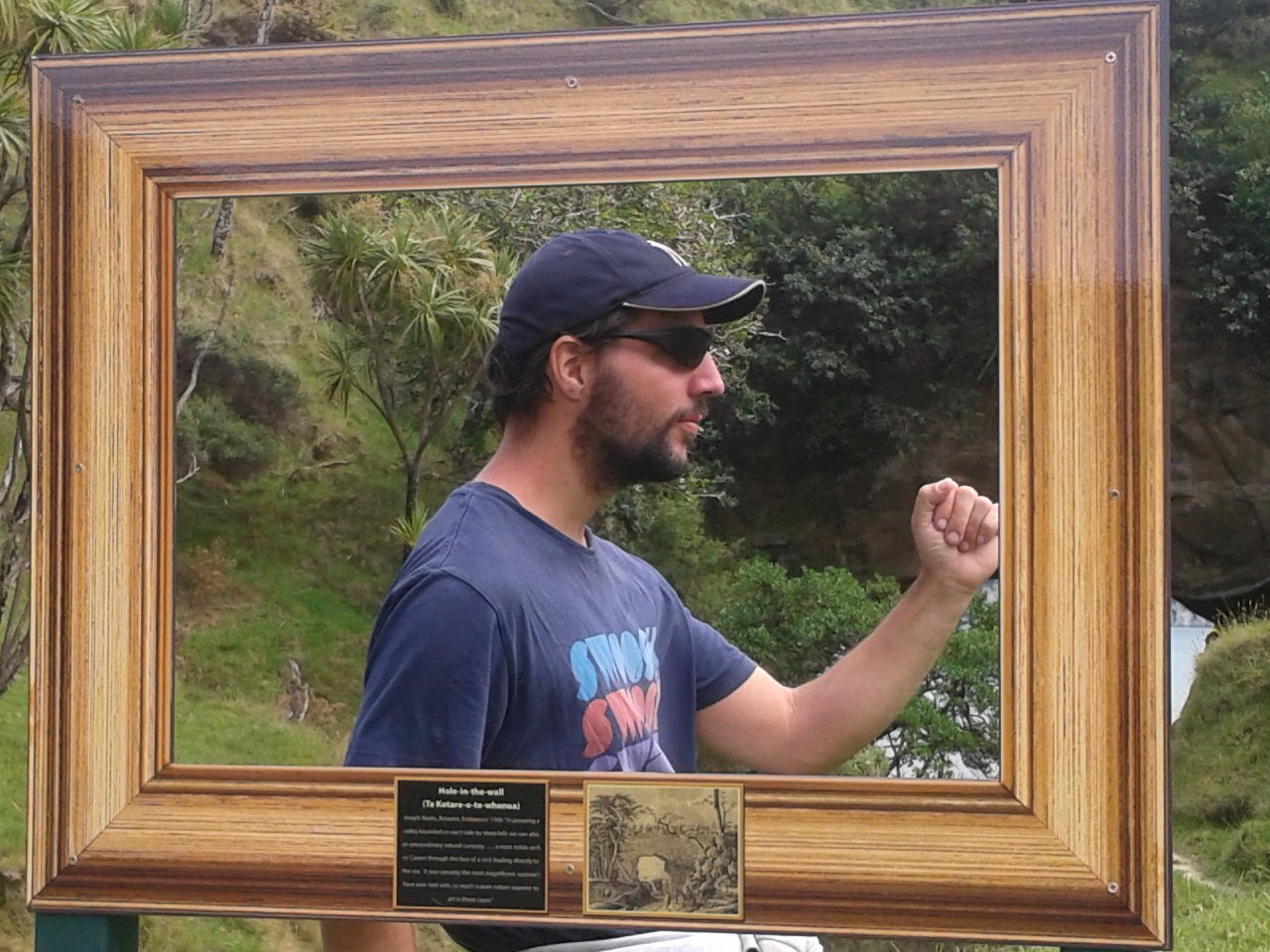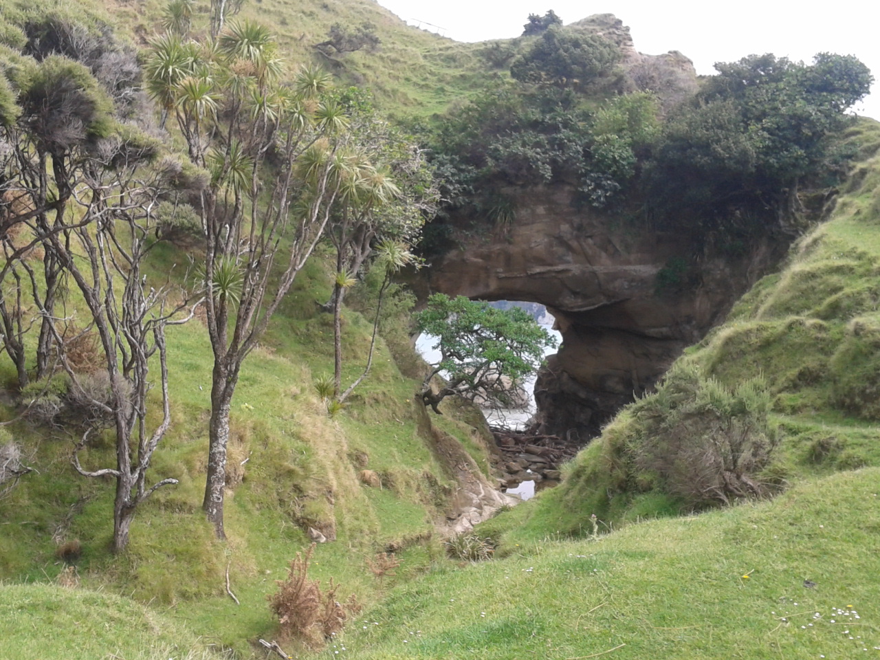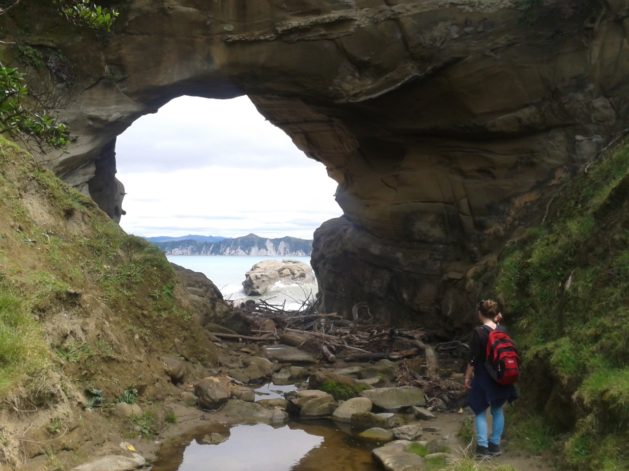 Aber hey, wann fängt man schonmal einen Tag so früh an? Also machten wir uns auf den Weg, das Tagesziel sollte “Sunshine City” sein, Gisborne. Nach ca einer Dreiviertelstunde Fahrt fanden wir ein kleines Township, wo es öffentliche Toiletten gab und dazu noch eine recht bequeme Bank. Mit frischen Klamotten, leeren Blasen und gefüllten Mägen fuhr es sich dann doch direkt viel angenehmer, sodass wir entschlossen noch eine Wanderung zu unternehmen. Das Gebiet um Gisborne war nämlich die Stelle, wo James Cook Neuseeland entdeckte. Hier unternahmen er und seine Crew die ersten Schritte an Land und hatten den ersten Kontakt zu den Maoris. Und so gibt es einen Wanderweg, der zu der Stelle führt, wo Cook zum erstenmal den Boden von Neuseeland betrat. Dieser führt über einen von “Milliuuunen” Schafen bevölkerten Hügel bis zu einem Aussichtspunkt und dann durch einen Wald herunter zu dieser geschichtsträchtigen Stelle. Besonders spektakulär auf dem Weg war aber das “Hole in the Wall”, ein natürlicher kleiner Tunnel, durch den man hindurch bis zum Meer gehen kann.