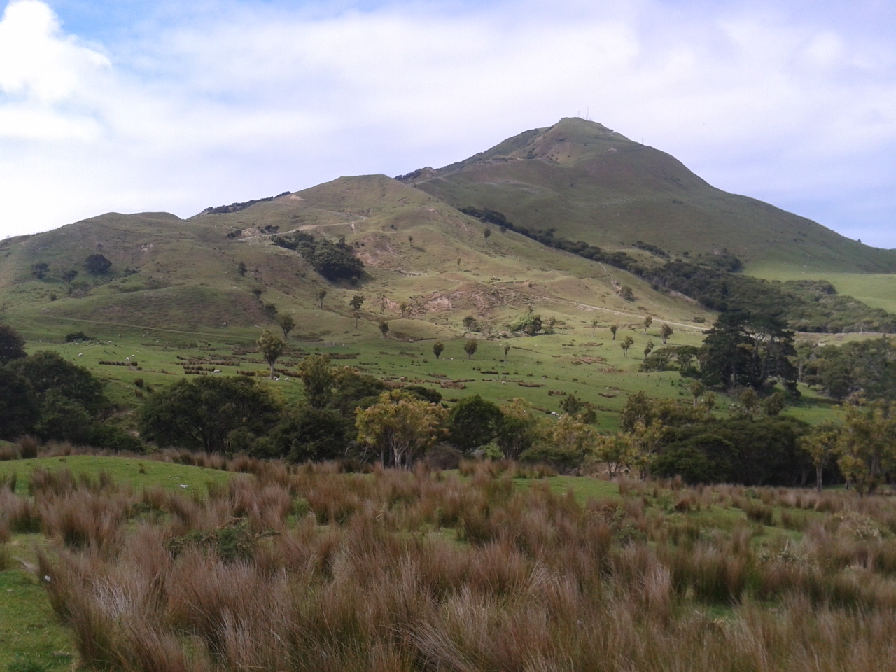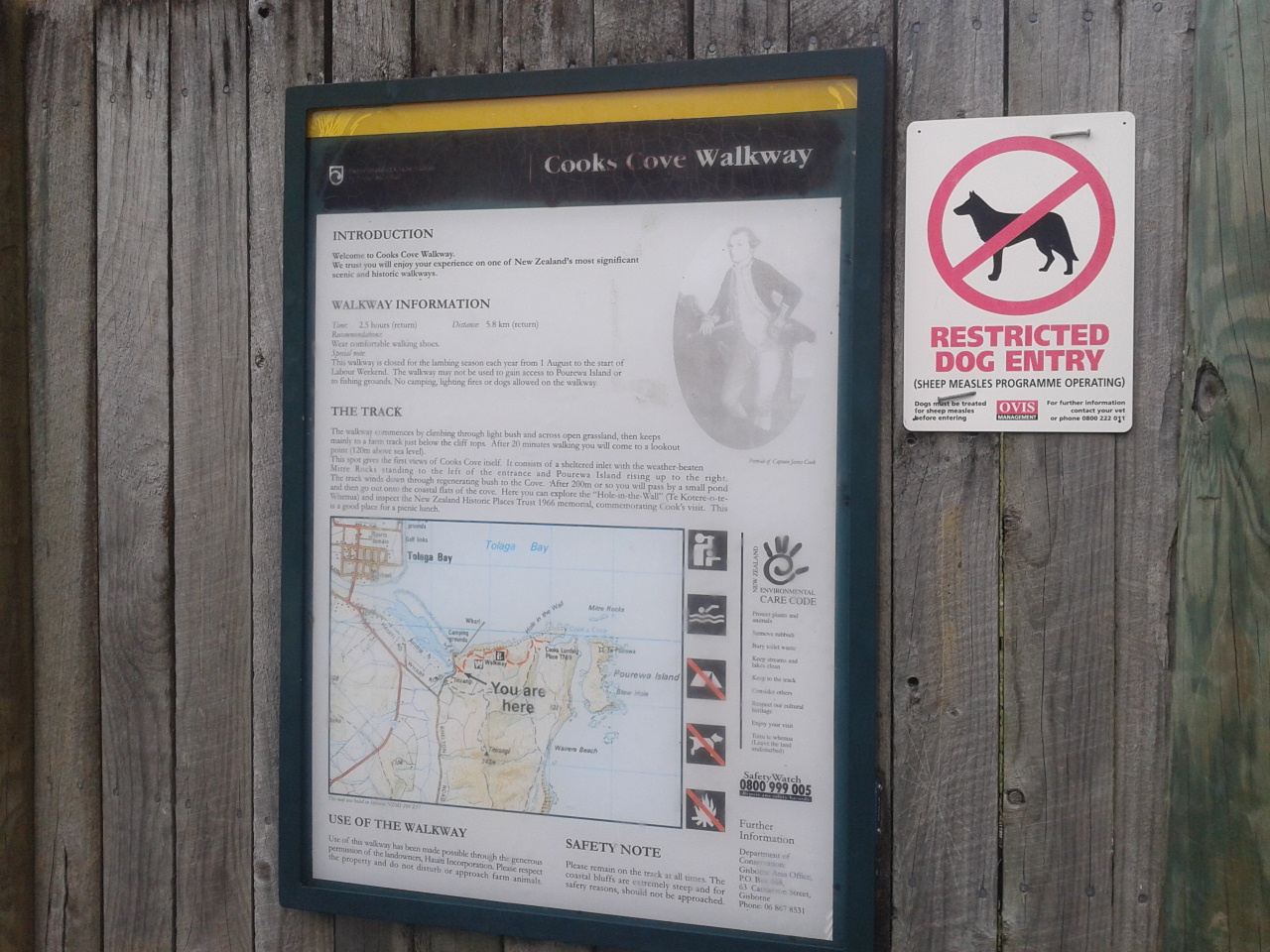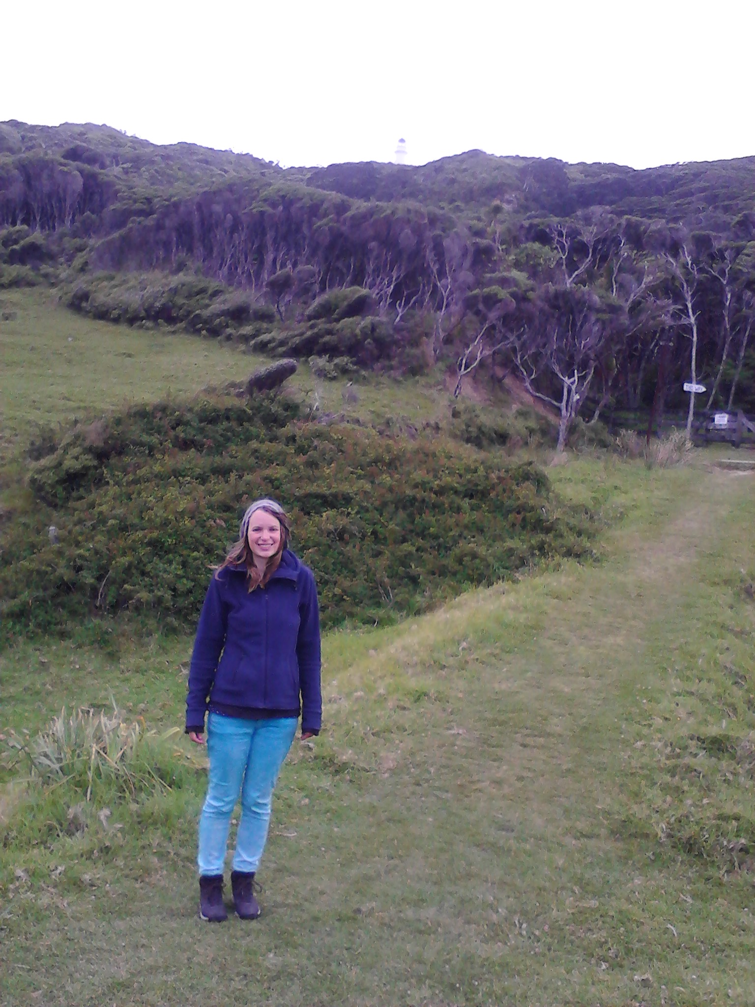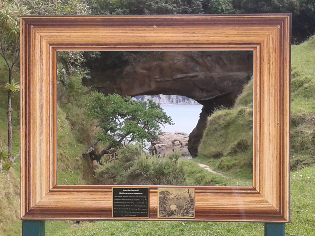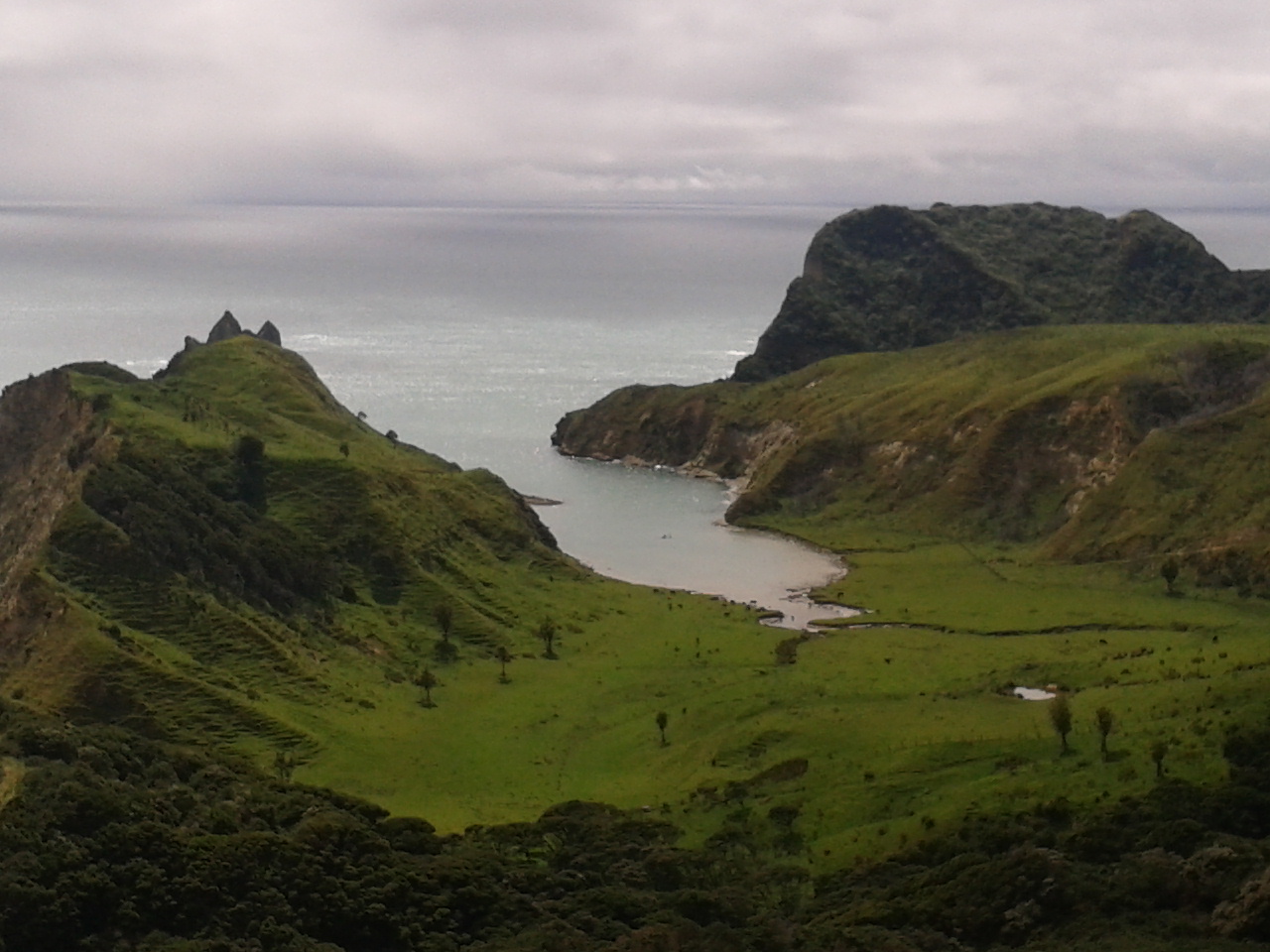 Aber hey, wann fängt man schonmal einen Tag so früh an? Also machten wir uns auf den Weg, das Tagesziel sollte “Sunshine City” sein, Gisborne. Nach ca einer Dreiviertelstunde Fahrt fanden wir ein kleines Township, wo es öffentliche Toiletten gab und dazu noch eine recht bequeme Bank. Mit frischen Klamotten, leeren Blasen und gefüllten Mägen fuhr es sich dann doch direkt viel angenehmer, sodass wir entschlossen noch eine Wanderung zu unternehmen. Das Gebiet um Gisborne war nämlich die Stelle, wo James Cook Neuseeland entdeckte. Hier unternahmen er und seine Crew die ersten Schritte an Land und hatten den ersten Kontakt zu den Maoris. Und so gibt es einen Wanderweg, der zu der Stelle führt, wo Cook zum erstenmal den Boden von Neuseeland betrat. Dieser führt über einen von “Milliuuunen” Schafen bevölkerten Hügel bis zu einem Aussichtspunkt und dann durch einen Wald herunter zu dieser geschichtsträchtigen Stelle. Besonders spektakulär auf dem Weg war aber das “Hole in the Wall”, ein natürlicher kleiner Tunnel, durch den man hindurch bis zum Meer gehen kann.