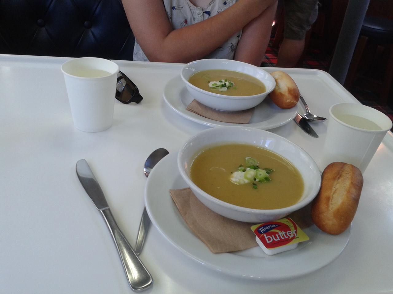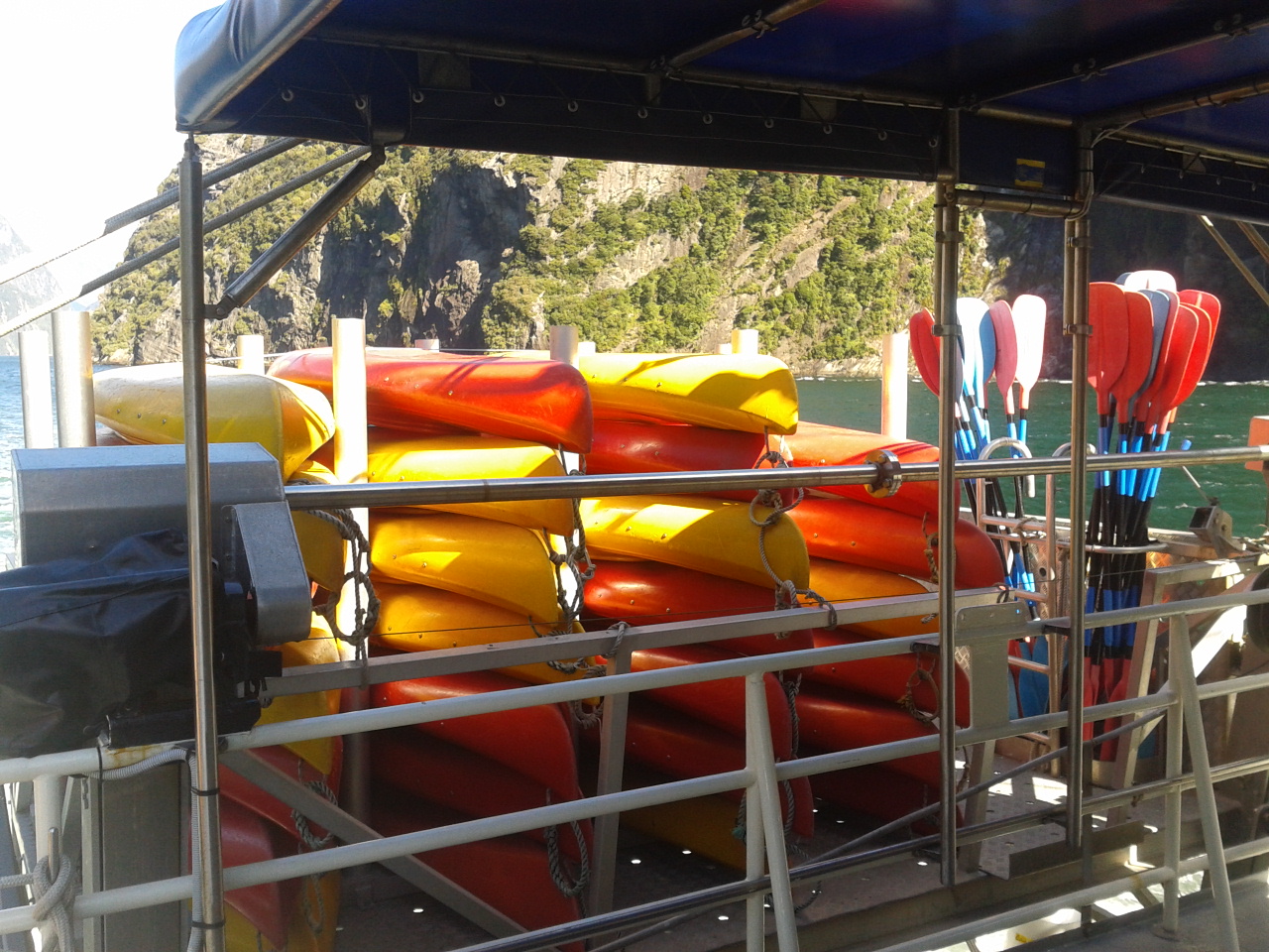 In dem Paket sind Dinner und Frühstück mit drin und nachdem wie abgelegt hatten gab es direkt mal den ersten Gang, eine Kumara-Lauch Suppe mit einem Klacks Blauschimmelkäse. Ja das war genauso lecker wie es klingt 🙂 Da sind wir also bei Süppchen durch den Sound gecruist und da es sehr windig war direkt zu der geschützten Harrison Cove, wo wir auch über Nacht geankert haben. Und dann ging es los mit den Wasseraktivitäten, Kajak oder mit dem Beibootchen raus. Wir sind kajaken gegeangen und das war ziemlich spaßig! Nur leider hatte Nini ganz eklige Kopfschmerzen und war ziemlich fertig danach. Es gab sogar Duschen an Bord und erfrischt ging es dann gegen 7 zum Abendessen. Es gab Schweinebraten in Rotweinsoße, ein Pilz-Aprikosen Tartlett und kleine Kartöffelchen. Außerdem Gemüse und Salat zum selbst bedienen. Dank der tollen Kopfschmerzen konnte Nini fast nix essen, aber dafür wurde Heiko richtig satt! Zum Nachtisch ging es Nini dann schon besser, zum Glück. Es gab nämlich ein Käseküchlein mit Sahne, Vanilleeis und ein paar Erd- und Blaubeeren. Neben diesem wunderbaren Essen gab es die ganze Zeit eine Selbstbedienungsbar mit Tee, Kaffee und Kakao und so waren wir wirklich bestens versorgt.