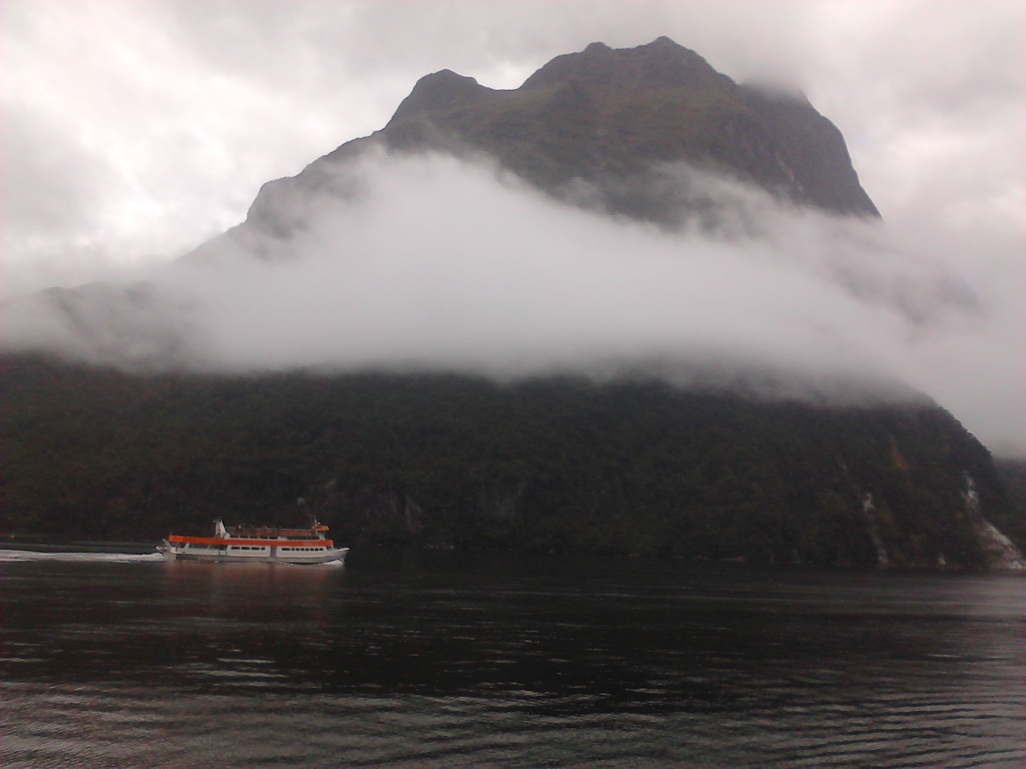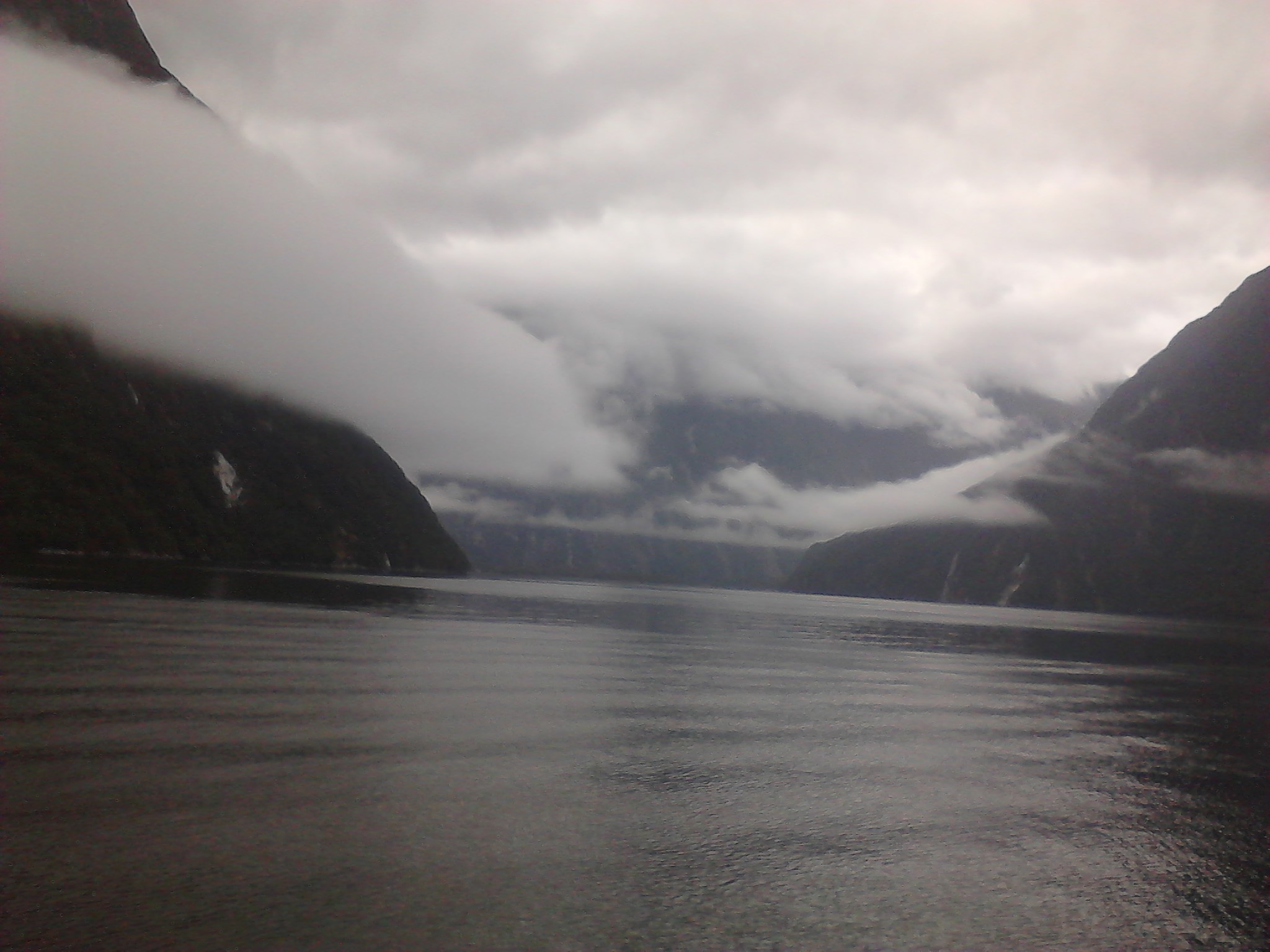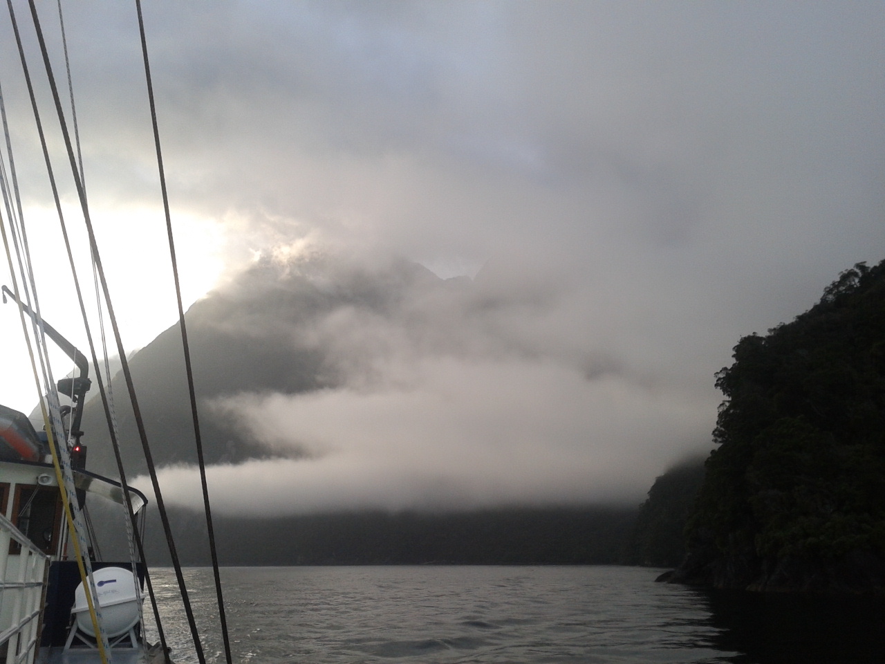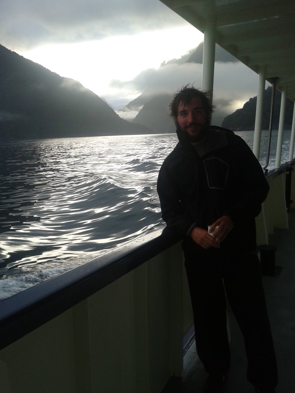 Nach dem Essen haben wie ein bisschen Scrabble auf englisch gespielt (gar nicht soo einfach) und dem Sound beim dunkelwerden zugeguckt. Als es dunkel war haben wir dann an Deck ein Bierchen getrunken und Sterne geguckt. Richtig schön, nach einem warmen sonnigen Tag gab es trotzdem eine milde klare Nacht zum Sternegucken. Bis jetzt war uns der Milford Sound wohlgesinnt. Der nächste morgen war dagegen grau und verhangen, das war aber gar nicht schlimm, es sah nämlich wirklich spektakulär aus, wie Nebel und Wolken in dieser Landschaft hingen. Nachdem wir um 7 Uhr ein Frühstück aus Rührei, Speck, Toast und Müsli und noch viel mehr verfuttert hatten ging es raus auf die tasmanische See. Echt toll und beeindruckend wie der Sound von dort aussieht. Man kann sich gut vorstellen, dass Captain Cook hier zweimal am Sound vorbeigesegelt ist, der Eingang ist vom Meer aus nämlich wirklich nicht zu sehen. Tja und dann ging es auch schon langsam wieder heimwärts, mit Kommentar was man so rechts und links sieht. Unter anderem einen Wasserfall, der 3 mal so hoch ist wie die Niagara Fälle! Um halb 10 hatten wie wieder festen Boden unter den Füßen und sind mit strahlenden Augen weitergefahren.