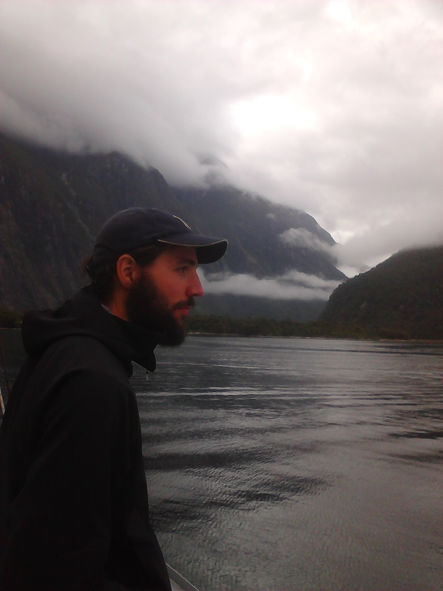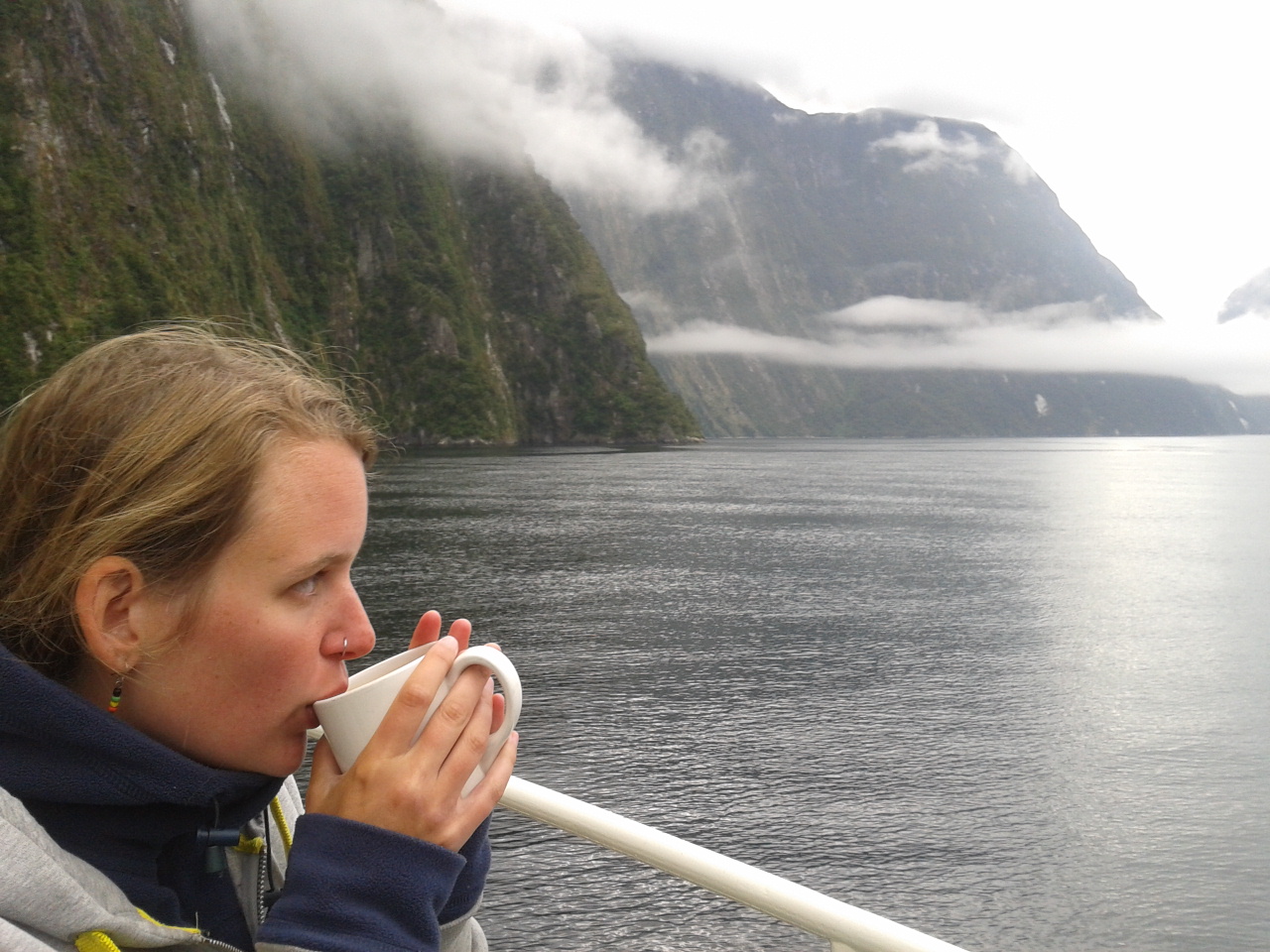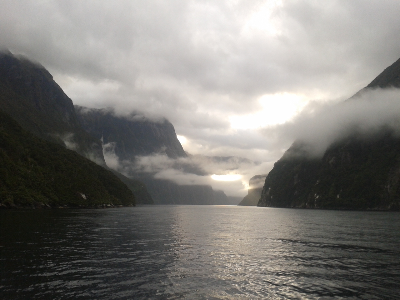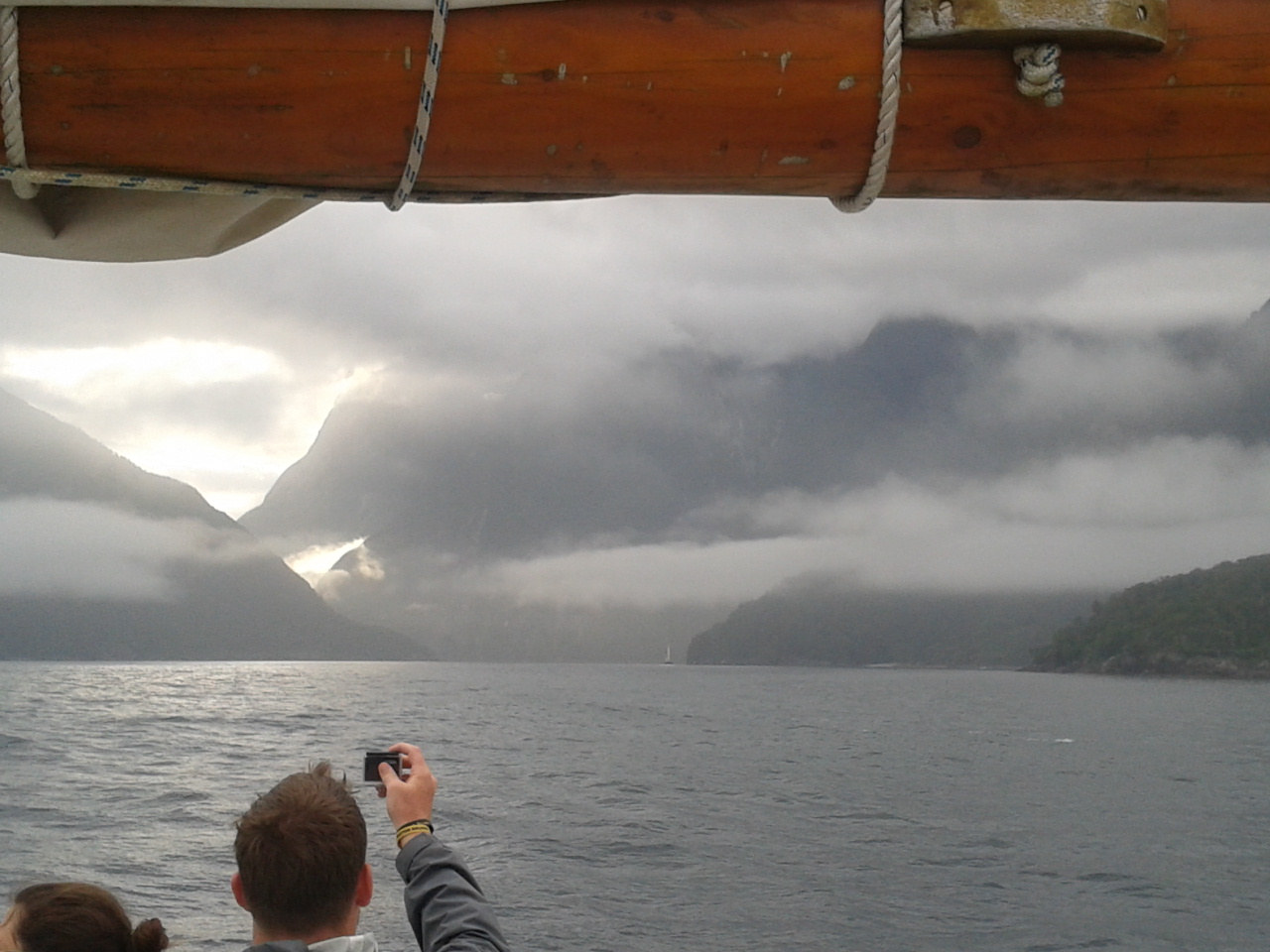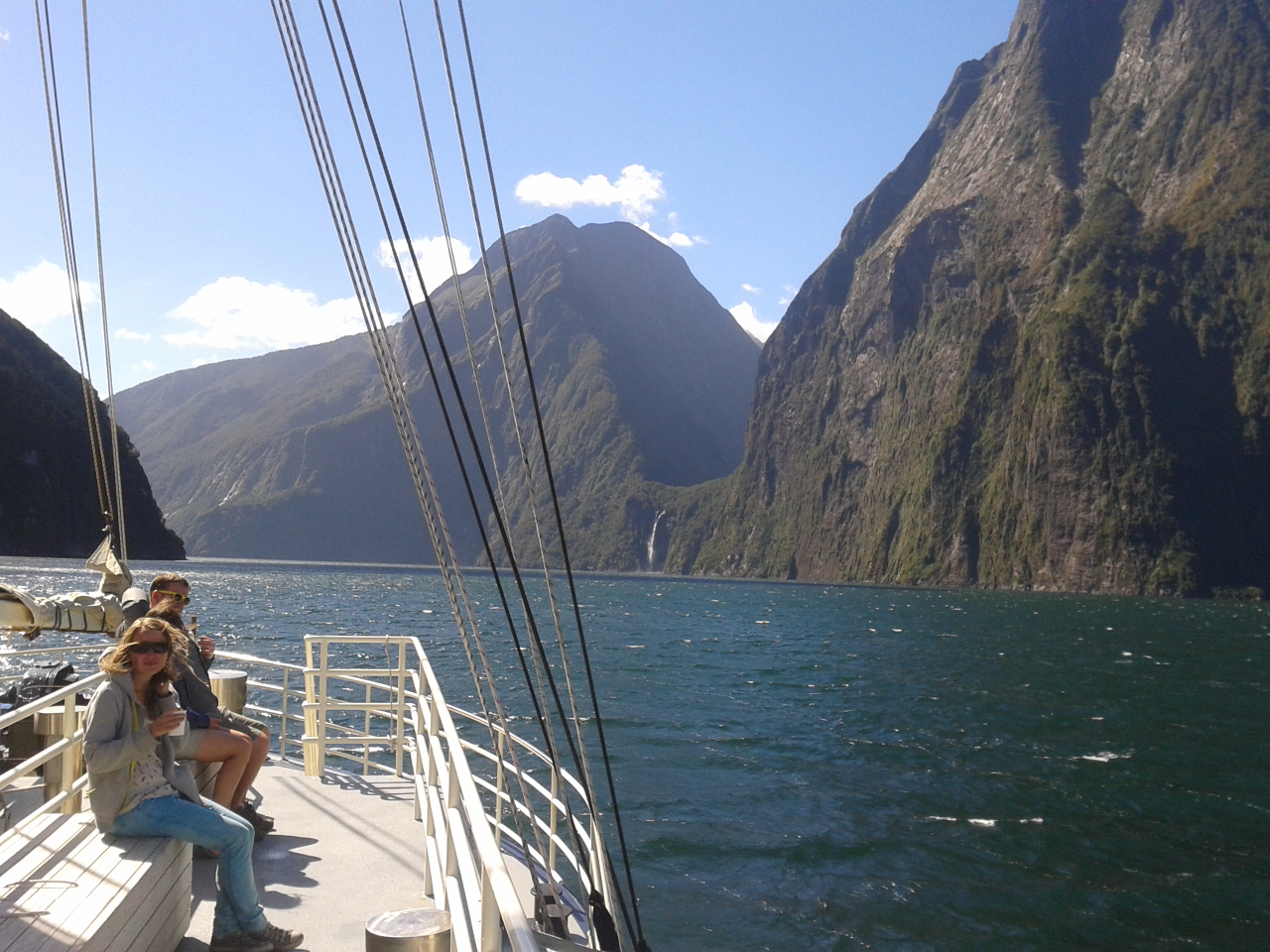 Nach dem Essen haben wie ein bisschen Scrabble auf englisch gespielt (gar nicht soo einfach) und dem Sound beim dunkelwerden zugeguckt. Als es dunkel war haben wir dann an Deck ein Bierchen getrunken und Sterne geguckt. Richtig schön, nach einem warmen sonnigen Tag gab es trotzdem eine milde klare Nacht zum Sternegucken. Bis jetzt war uns der Milford Sound wohlgesinnt. Der nächste morgen war dagegen grau und verhangen, das war aber gar nicht schlimm, es sah nämlich wirklich spektakulär aus, wie Nebel und Wolken in dieser Landschaft hingen. Nachdem wir um 7 Uhr ein Frühstück aus Rührei, Speck, Toast und Müsli und noch viel mehr verfuttert hatten ging es raus auf die tasmanische See. Echt toll und beeindruckend wie der Sound von dort aussieht. Man kann sich gut vorstellen, dass Captain Cook hier zweimal am Sound vorbeigesegelt ist, der Eingang ist vom Meer aus nämlich wirklich nicht zu sehen. Tja und dann ging es auch schon langsam wieder heimwärts, mit Kommentar was man so rechts und links sieht. Unter anderem einen Wasserfall, der 3 mal so hoch ist wie die Niagara Fälle! Um halb 10 hatten wie wieder festen Boden unter den Füßen und sind mit strahlenden Augen weitergefahren.