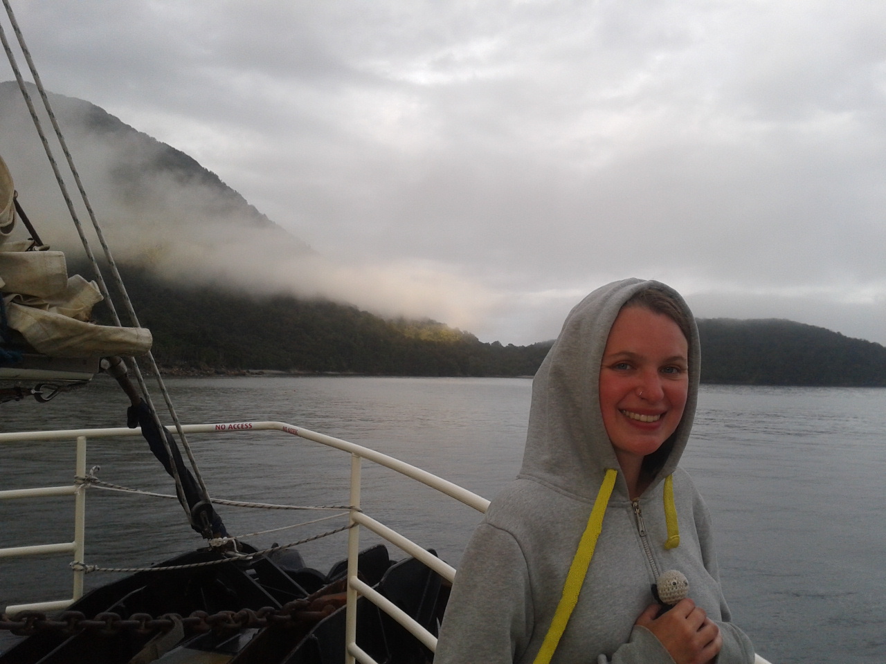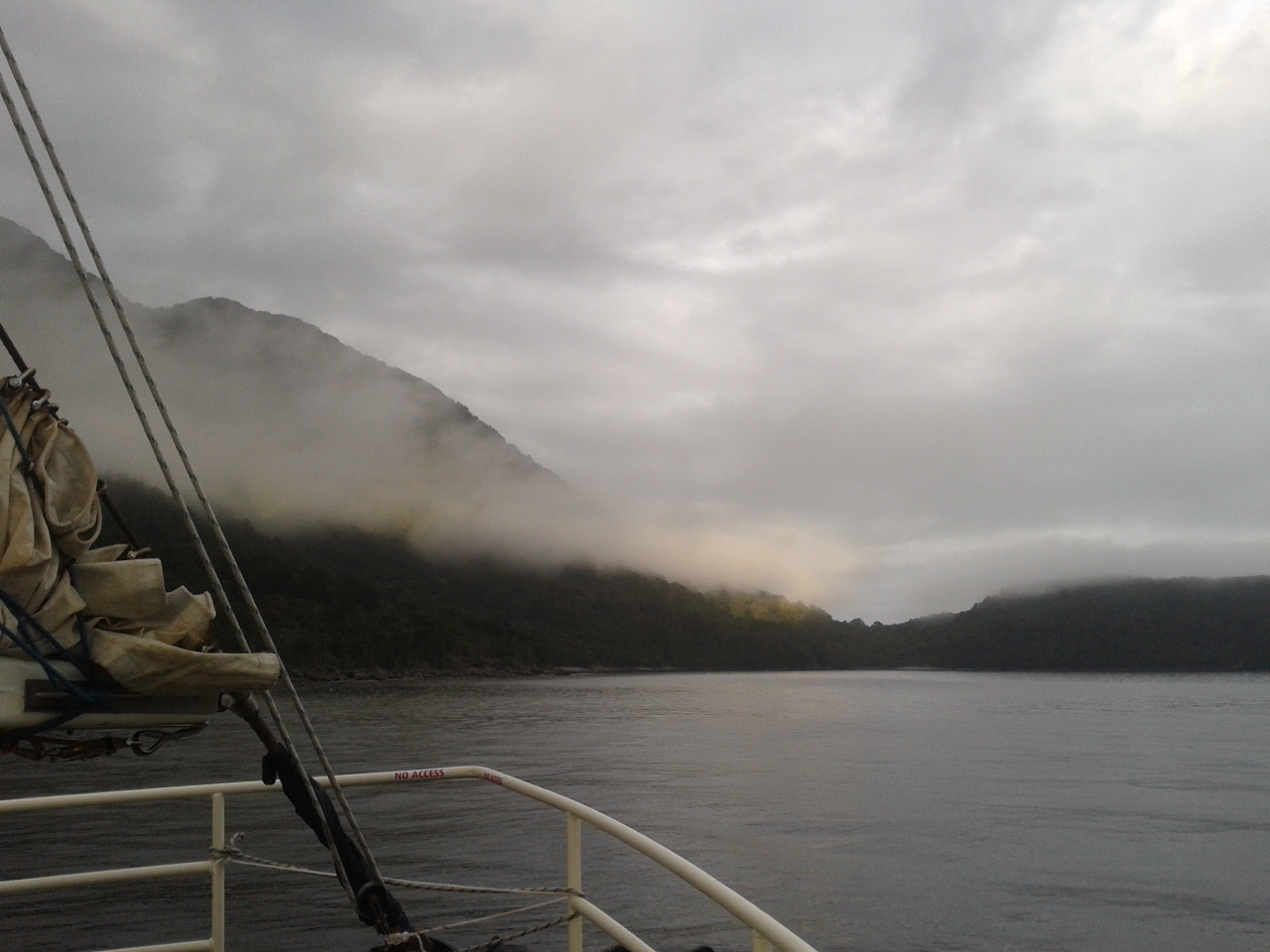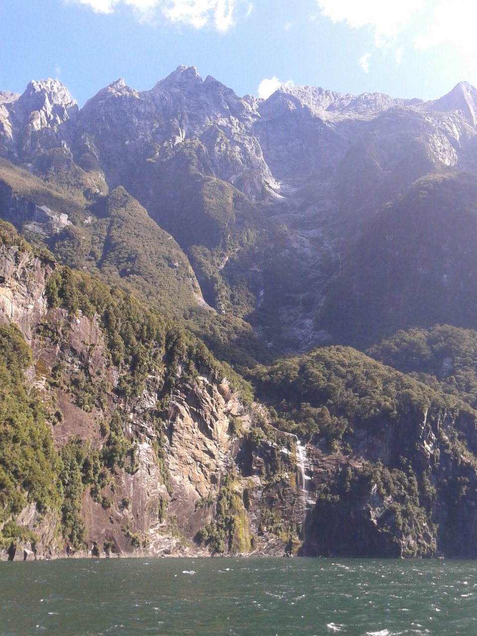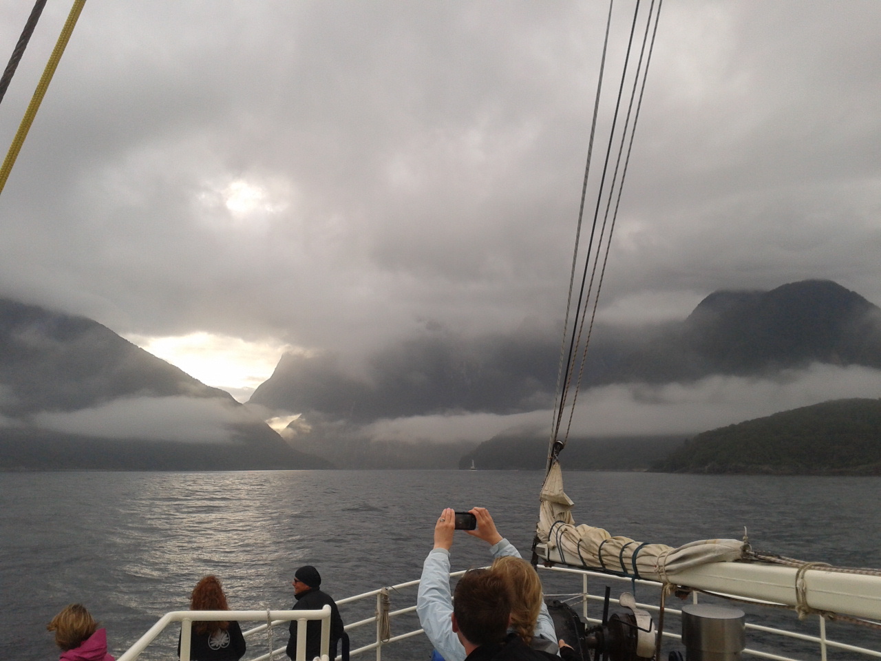 Nach dem Essen haben wie ein bisschen Scrabble auf englisch gespielt (gar nicht soo einfach) und dem Sound beim dunkelwerden zugeguckt. Als es dunkel war haben wir dann an Deck ein Bierchen getrunken und Sterne geguckt. Richtig schön, nach einem warmen sonnigen Tag gab es trotzdem eine milde klare Nacht zum Sternegucken. Bis jetzt war uns der Milford Sound wohlgesinnt. Der nächste morgen war dagegen grau und verhangen, das war aber gar nicht schlimm, es sah nämlich wirklich spektakulär aus, wie Nebel und Wolken in dieser Landschaft hingen. Nachdem wir um 7 Uhr ein Frühstück aus Rührei, Speck, Toast und Müsli und noch viel mehr verfuttert hatten ging es raus auf die tasmanische See. Echt toll und beeindruckend wie der Sound von dort aussieht. Man kann sich gut vorstellen, dass Captain Cook hier zweimal am Sound vorbeigesegelt ist, der Eingang ist vom Meer aus nämlich wirklich nicht zu sehen. Tja und dann ging es auch schon langsam wieder heimwärts, mit Kommentar was man so rechts und links sieht. Unter anderem einen Wasserfall, der 3 mal so hoch ist wie die Niagara Fälle! Um halb 10 hatten wie wieder festen Boden unter den Füßen und sind mit strahlenden Augen weitergefahren.