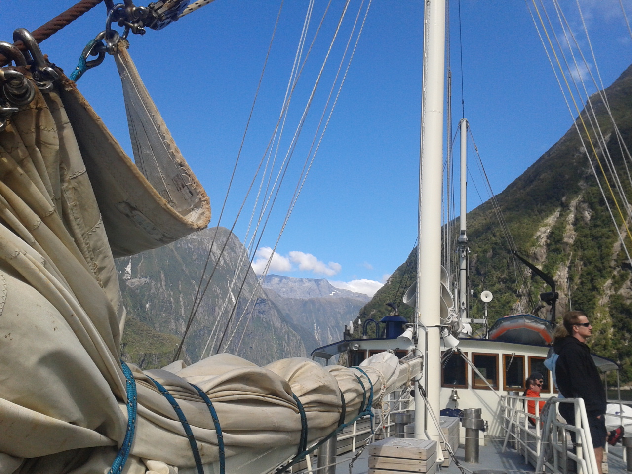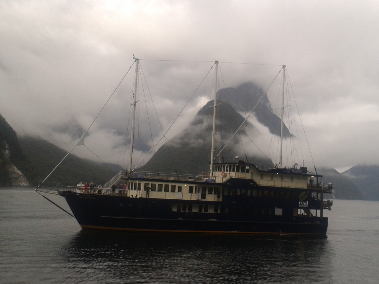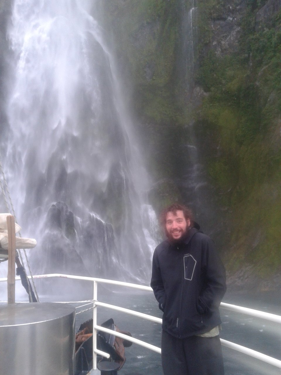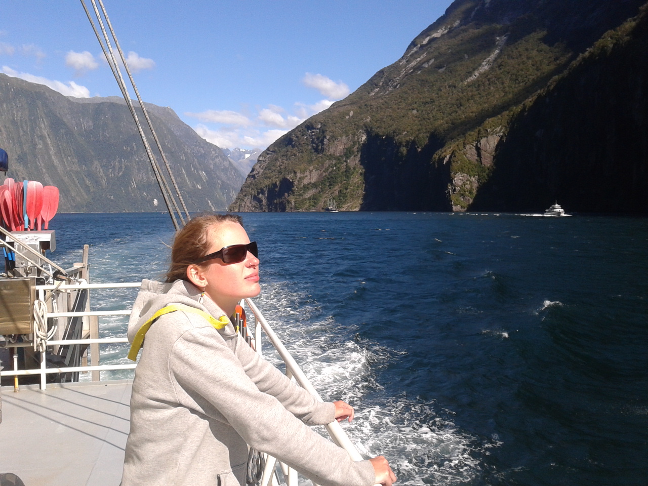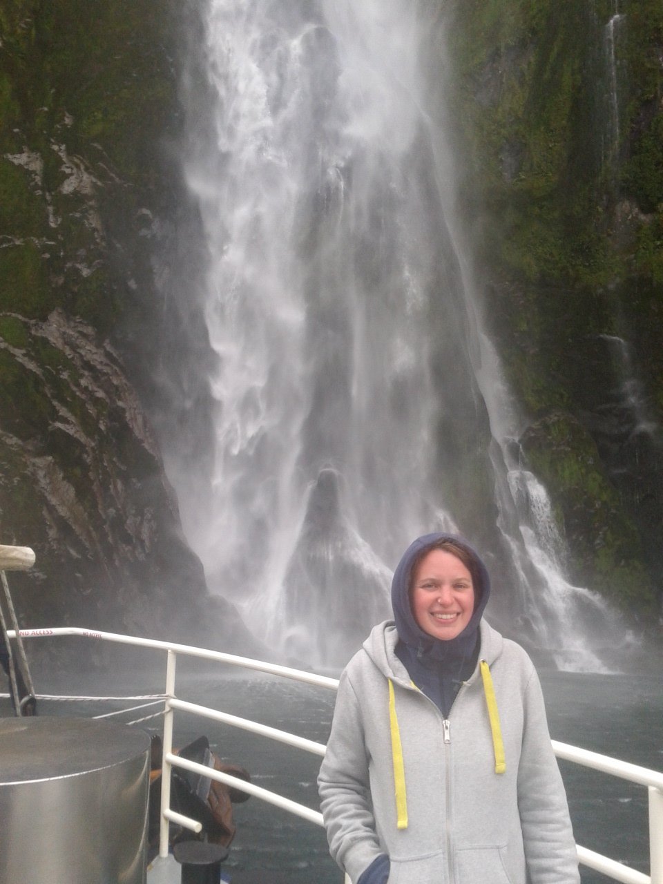 Nach dem Essen haben wie ein bisschen Scrabble auf englisch gespielt (gar nicht soo einfach) und dem Sound beim dunkelwerden zugeguckt. Als es dunkel war haben wir dann an Deck ein Bierchen getrunken und Sterne geguckt. Richtig schön, nach einem warmen sonnigen Tag gab es trotzdem eine milde klare Nacht zum Sternegucken. Bis jetzt war uns der Milford Sound wohlgesinnt. Der nächste morgen war dagegen grau und verhangen, das war aber gar nicht schlimm, es sah nämlich wirklich spektakulär aus, wie Nebel und Wolken in dieser Landschaft hingen. Nachdem wir um 7 Uhr ein Frühstück aus Rührei, Speck, Toast und Müsli und noch viel mehr verfuttert hatten ging es raus auf die tasmanische See. Echt toll und beeindruckend wie der Sound von dort aussieht. Man kann sich gut vorstellen, dass Captain Cook hier zweimal am Sound vorbeigesegelt ist, der Eingang ist vom Meer aus nämlich wirklich nicht zu sehen. Tja und dann ging es auch schon langsam wieder heimwärts, mit Kommentar was man so rechts und links sieht. Unter anderem einen Wasserfall, der 3 mal so hoch ist wie die Niagara Fälle! Um halb 10 hatten wie wieder festen Boden unter den Füßen und sind mit strahlenden Augen weitergefahren.