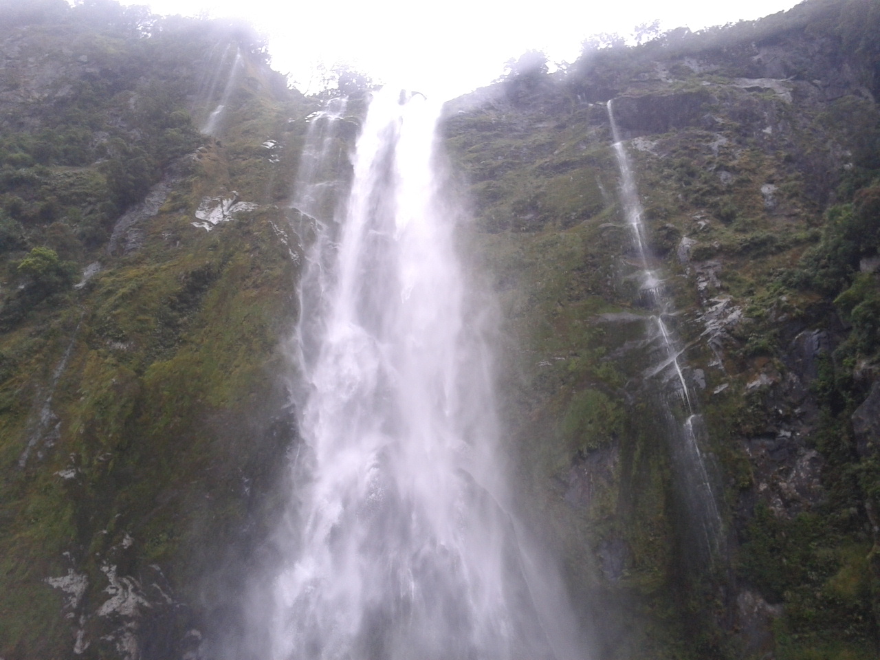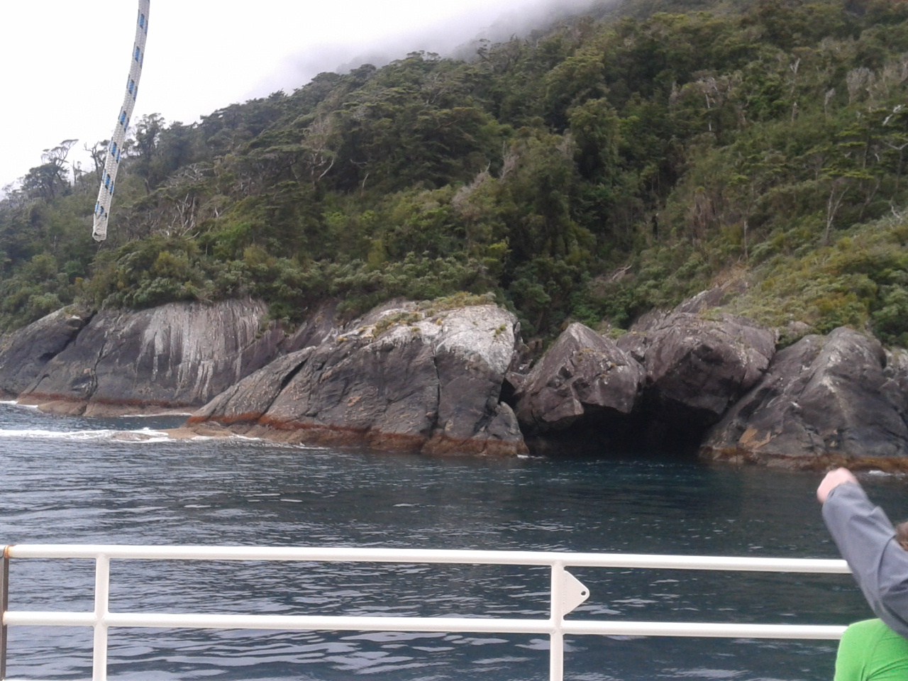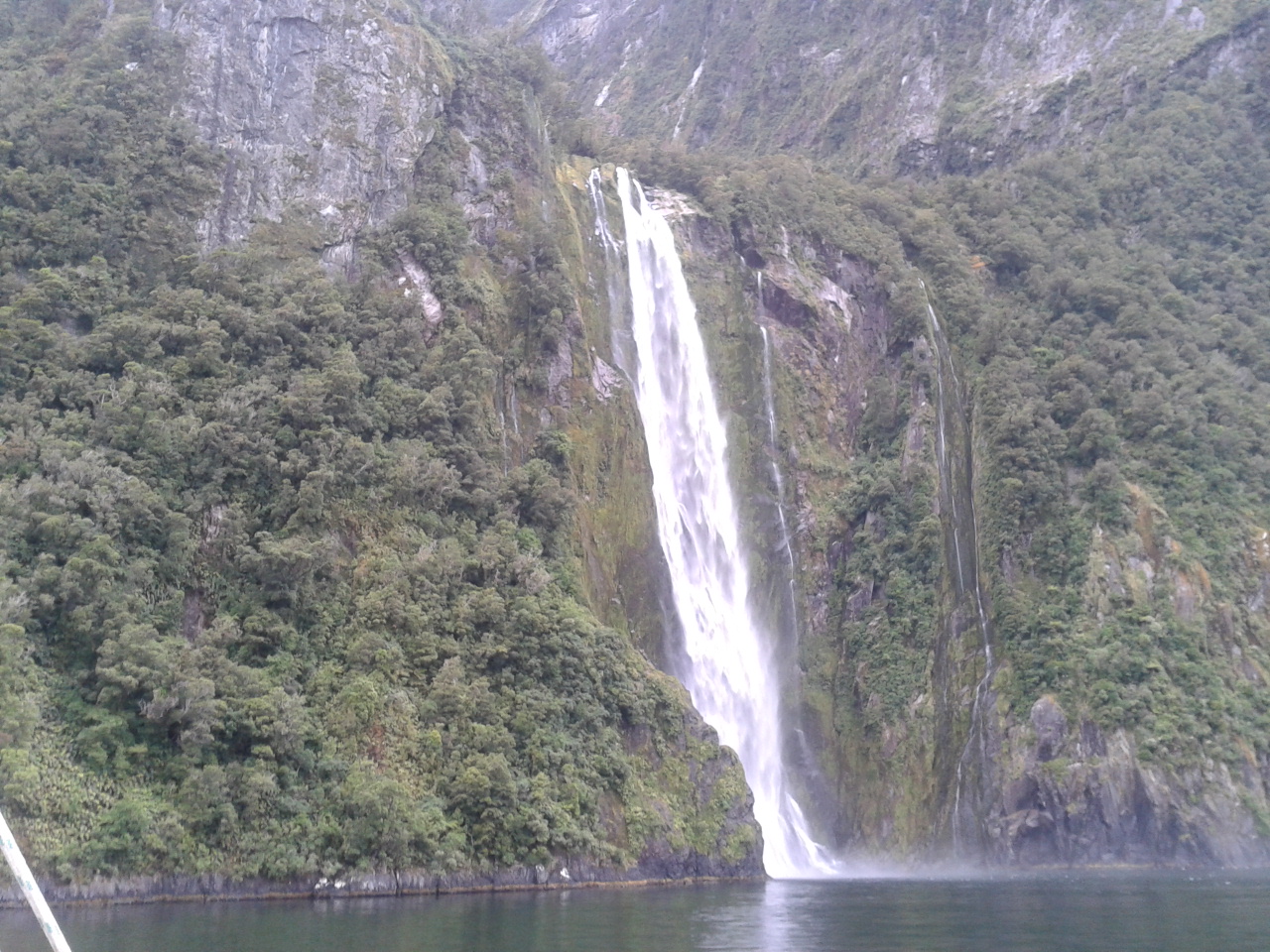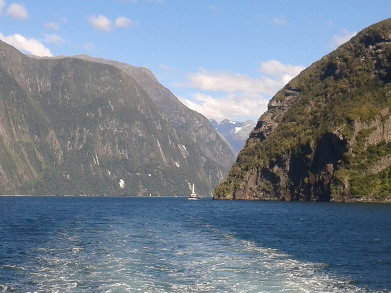 Nach dem Essen haben wie ein bisschen Scrabble auf englisch gespielt (gar nicht soo einfach) und dem Sound beim dunkelwerden zugeguckt. Als es dunkel war haben wir dann an Deck ein Bierchen getrunken und Sterne geguckt. Richtig schön, nach einem warmen sonnigen Tag gab es trotzdem eine milde klare Nacht zum Sternegucken. Bis jetzt war uns der Milford Sound wohlgesinnt. Der nächste morgen war dagegen grau und verhangen, das war aber gar nicht schlimm, es sah nämlich wirklich spektakulär aus, wie Nebel und Wolken in dieser Landschaft hingen. Nachdem wir um 7 Uhr ein Frühstück aus Rührei, Speck, Toast und Müsli und noch viel mehr verfuttert hatten ging es raus auf die tasmanische See. Echt toll und beeindruckend wie der Sound von dort aussieht. Man kann sich gut vorstellen, dass Captain Cook hier zweimal am Sound vorbeigesegelt ist, der Eingang ist vom Meer aus nämlich wirklich nicht zu sehen. Tja und dann ging es auch schon langsam wieder heimwärts, mit Kommentar was man so rechts und links sieht. Unter anderem einen Wasserfall, der 3 mal so hoch ist wie die Niagara Fälle! Um halb 10 hatten wie wieder festen Boden unter den Füßen und sind mit strahlenden Augen weitergefahren.